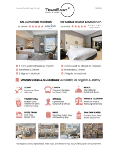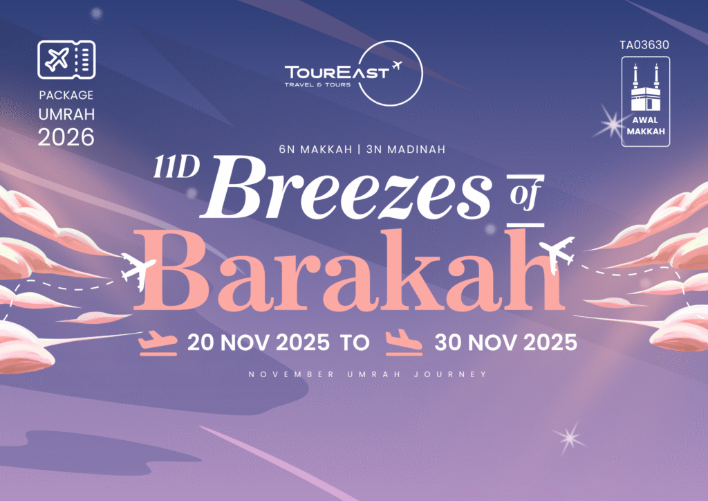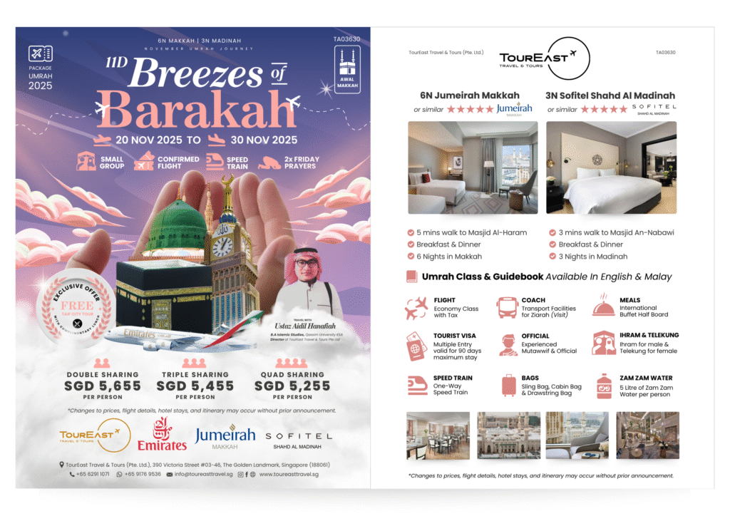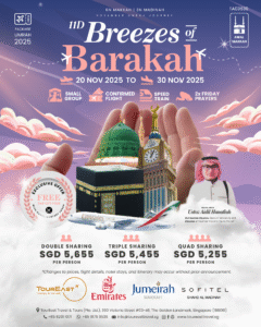 Step into a journey of peace, purpose & prayer this November. Join us for an exclusive small-group Umrah led by Ustaz Aidil Hanafiah, featuring top-tier comfort at Jumeirah Makkah & Sofitel Madinah, confirmed Emirates flights, and a bonus FREE Taif City Tour.